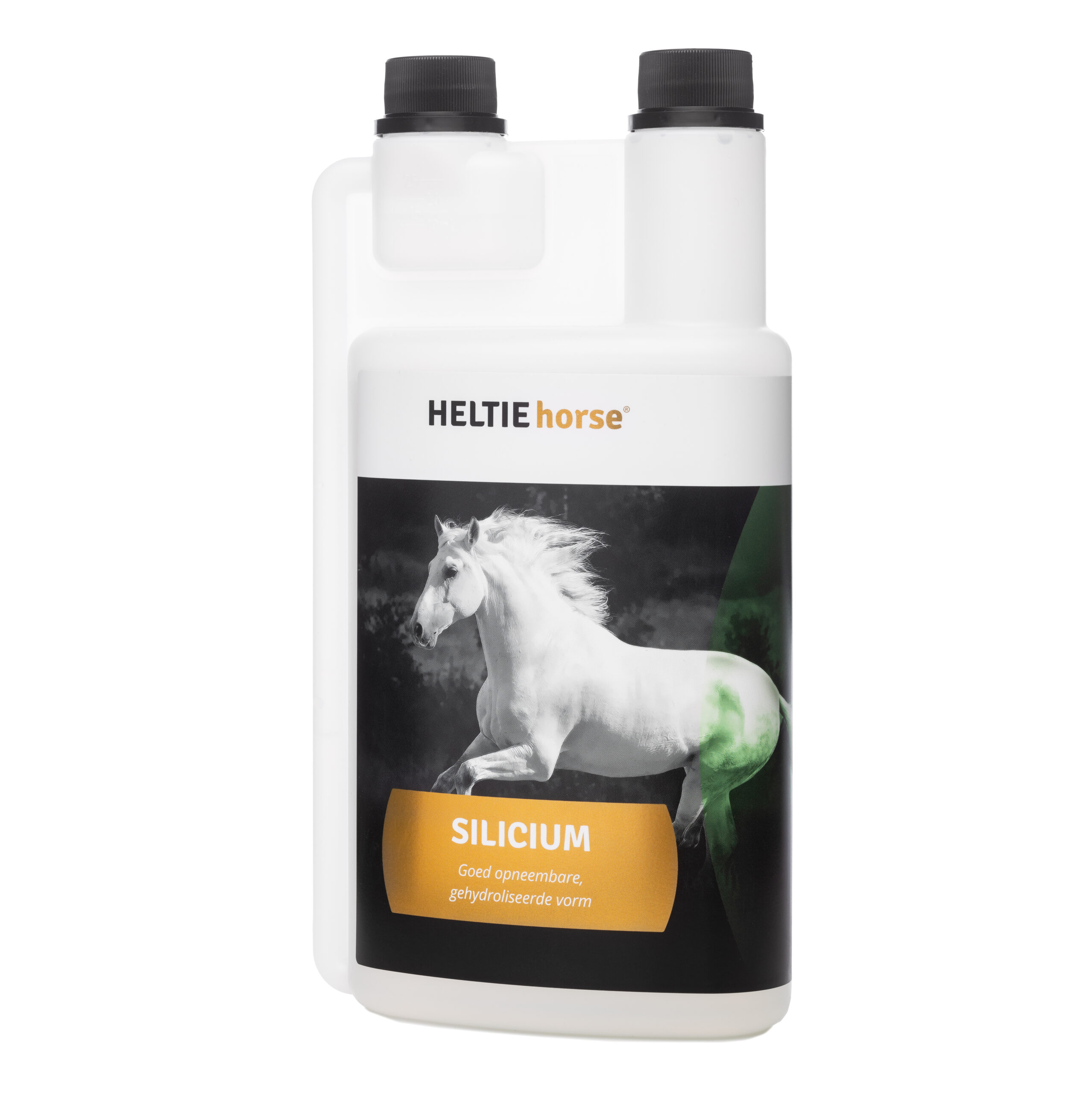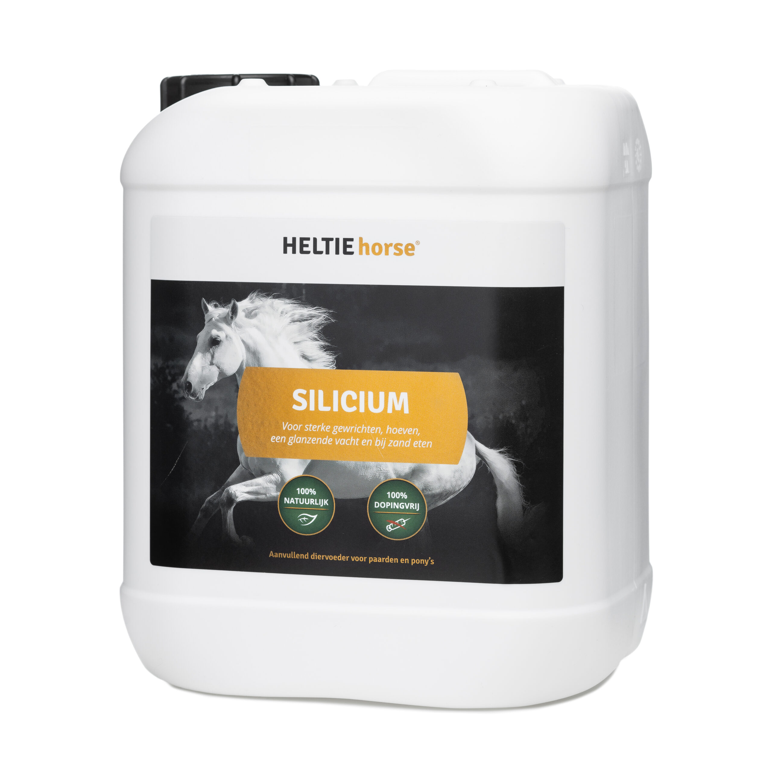 HELTIE horse® Silicium is samengesteld uit gehydroliseerd silicium en ondersteunt de opbouw van botten, kraakbeen, hoeven, huid en vacht bij paarden. Silicium, als mineraal, bevordert de aanmaak van natuurlijke glucosamine in het lichaam en kan nuttig zijn voor paarden die zand eten of die kampen met een minder goede kwaliteit van hun hoeven. Dit product bevat een actieve en gehydroliseerde vorm van silicium, die volledig door het lichaam kan worden opgenomen, dankzij de zeer kleine siliciummoleculen die de darmwand kunnen passeren.