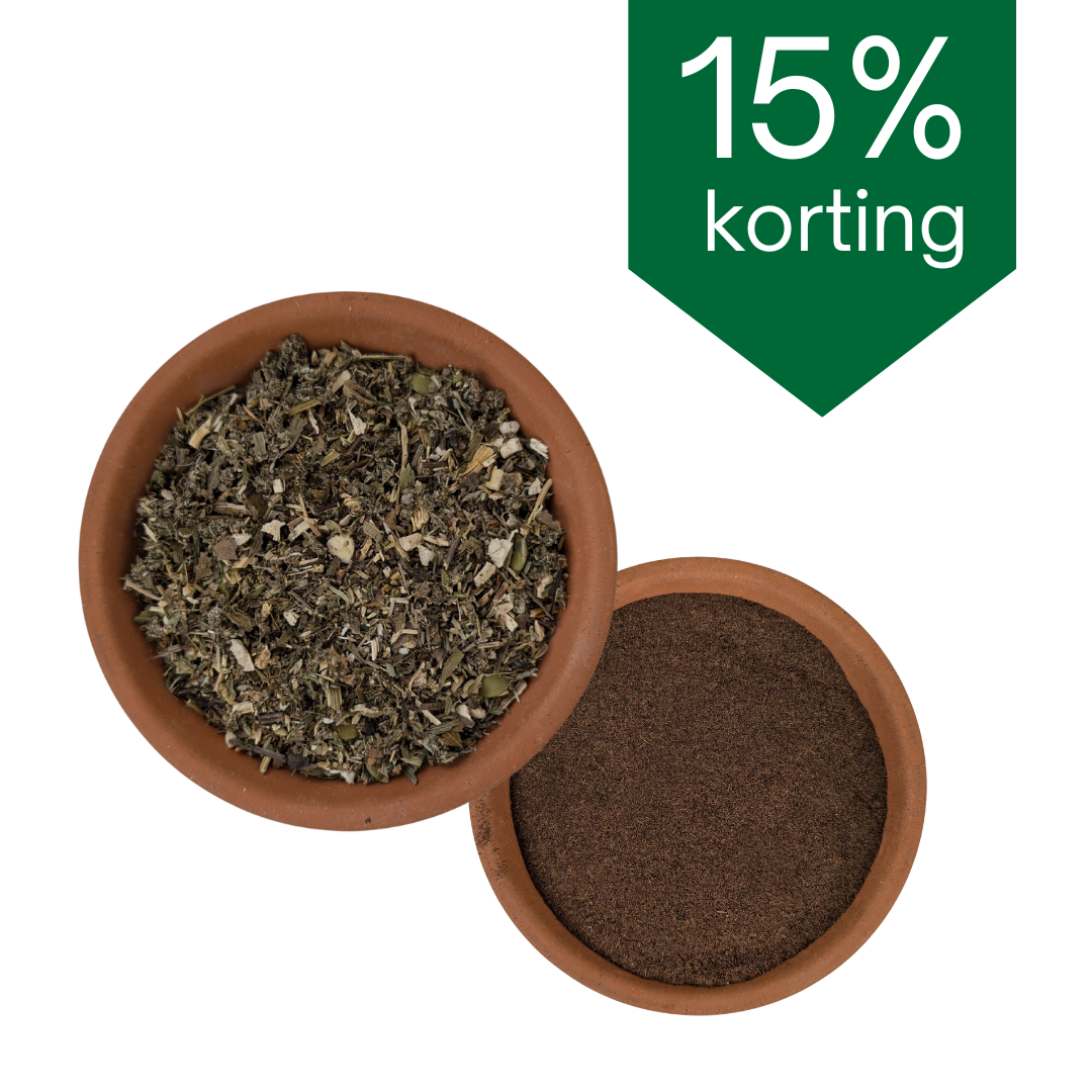 - Lapachorinde Schors (500 gr): Afkomstig van de “boom des levens”. Lapacho staat bekend om zijn ondersteunende werking op de darmflora en het immuunsysteem. Het helpt het lichaam bij het afvoeren van afvalstoffen en ondersteunt een gezonde balans van schimmels en bacteriën in de darmen.