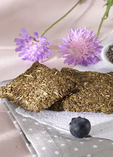 Samen met een uitgebreid mengsel van weidekruiden en hele vlozaden zijn OKAPI blauwe bessenkoekjes een gezonde en lichte snack, die met name geschikt is voor paarden met stofwisselingsproblemen. Op deze manier kunnen eigenaren van paarden met EMS, insulineresistentie, PSSM of vergelijkbare stofwisselingsproblemen hun paard op een gezonde manier belonen.