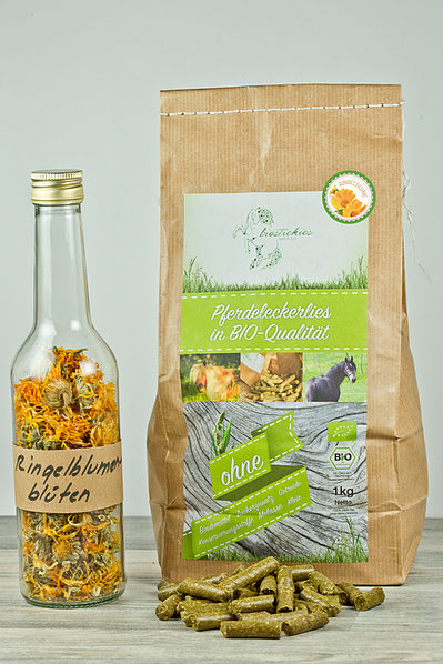 De gezonde traktatie: paardensnoepjes biologisch gemaakt van biologische weidehooi met een vleugje goudsbloem.