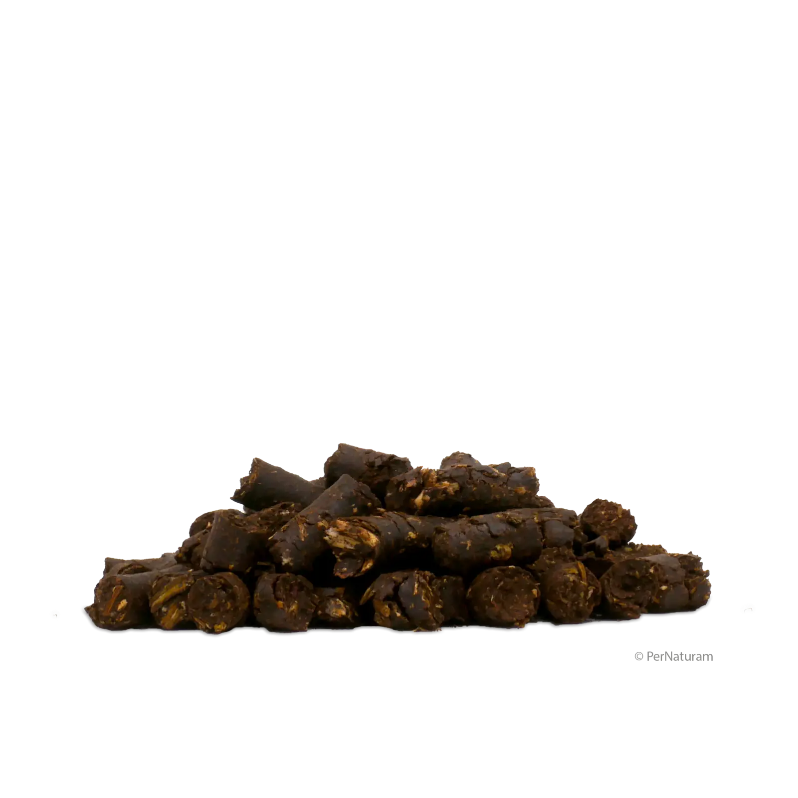 De actieve plantenbestanddelen en natuurlijke stoffen van de peloid pellets ondersteunen de stofwisseling. Door het absorptie- en zwelvermogen van de turf en door de vruchten en zaden die erin zitten, wordt overtollig vocht in de darm gebonden en vermindert de waterige ontlasting. De kruiden in de korrels verzachten het geïrriteerde darmslijmvlies en reguleren de darmactiviteit op milde wijze.