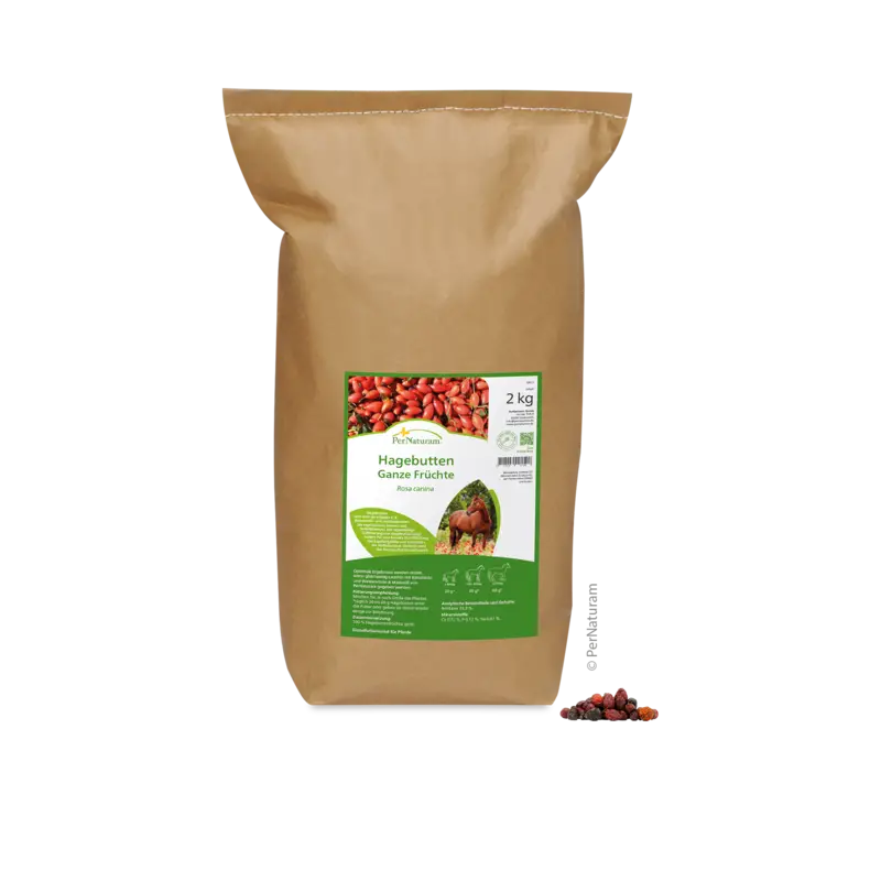 Meng, afhankelijk van de grootte van het paard, dagelijks een volle eetlepel tot een handvol rozenbottels door het voer, of geef er een paar als beloning.